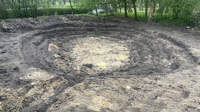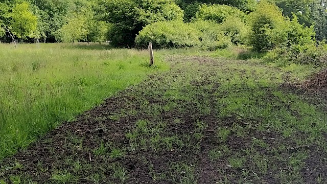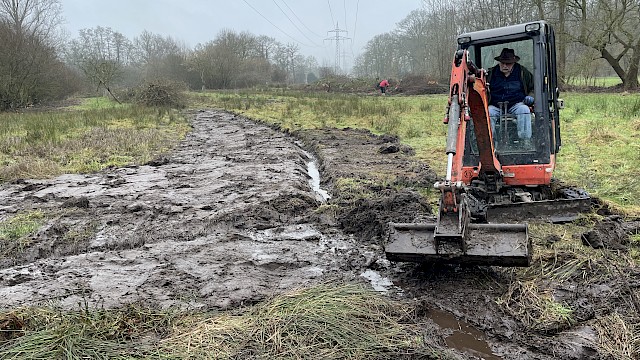 Zunächst wurden im März die alten Entwässerungsgräben freigelegt und durch zusätzliche Grabenabschnitte ergänzt, um die Staunässe zu rduzieren. An einer tiefen Stelle wurde eine kleine Senke ausgehoben, die den bei Starkregen anfallenden Niederschlag aus den Entwässerungsgräben aufnehmen kann. Dieses temporäre Kleingewässer kann künftig Amphibien einen Lebensraum bieten und vielleicht auch als Wasserspeicher für trockene Wetterperioden dienen. Auf einer 400 Quadratmeter großen Fläche, wo zuvor Erlen entfernt wurden, konnte im Frühjahr neues regionales Wiesensaatgut eingesät werden.