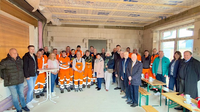 Die Erweiterung der Sozialräume des gemeindlichen Baubetriebshofes nimmt sichtbar Gestalt an. Im Rahmen eines „kleinen Richtfestes“, an dem neben der Belegschaft auch die Mitglieder des Gemeinderates teilnahmen, würdigte Bürgermeister Christoph Reents insbesondere den großen Anteil von Eigenleistungen durch Mitarbeitende des Bauhofes.