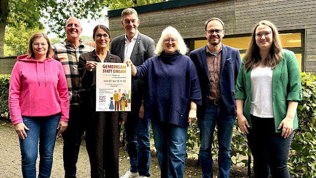 Anliegendes Foto: Die beteiligten Mitglieder aus dem Präventionsrat: Heike Pargmann (Ev.-luth. Kirchengemeinde), Michael Fröhlich (GWMF e.V.), Hilke Kenkel-Schwartz (Ratsmitglied), Christoph Reents (Bürgermeister), Andrea Glunde (Ratsmitglied), Sven Wiedenfeld (Amtsleiter) und Selina Söhnel (Seniorenservicebüro)