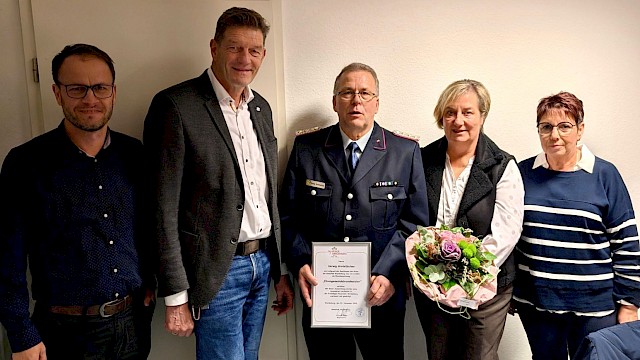 Foto v.l.n.r.: Amtsleiter Sven Wiedenfeld, Bürgermeister Christoph Reents, Herwig Grotelüschen mit Ehefrau Andrea, Feuerwehrausschuss-Vorsitzende Ada Hepner